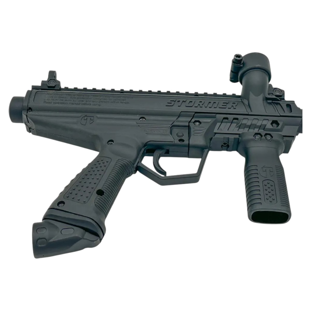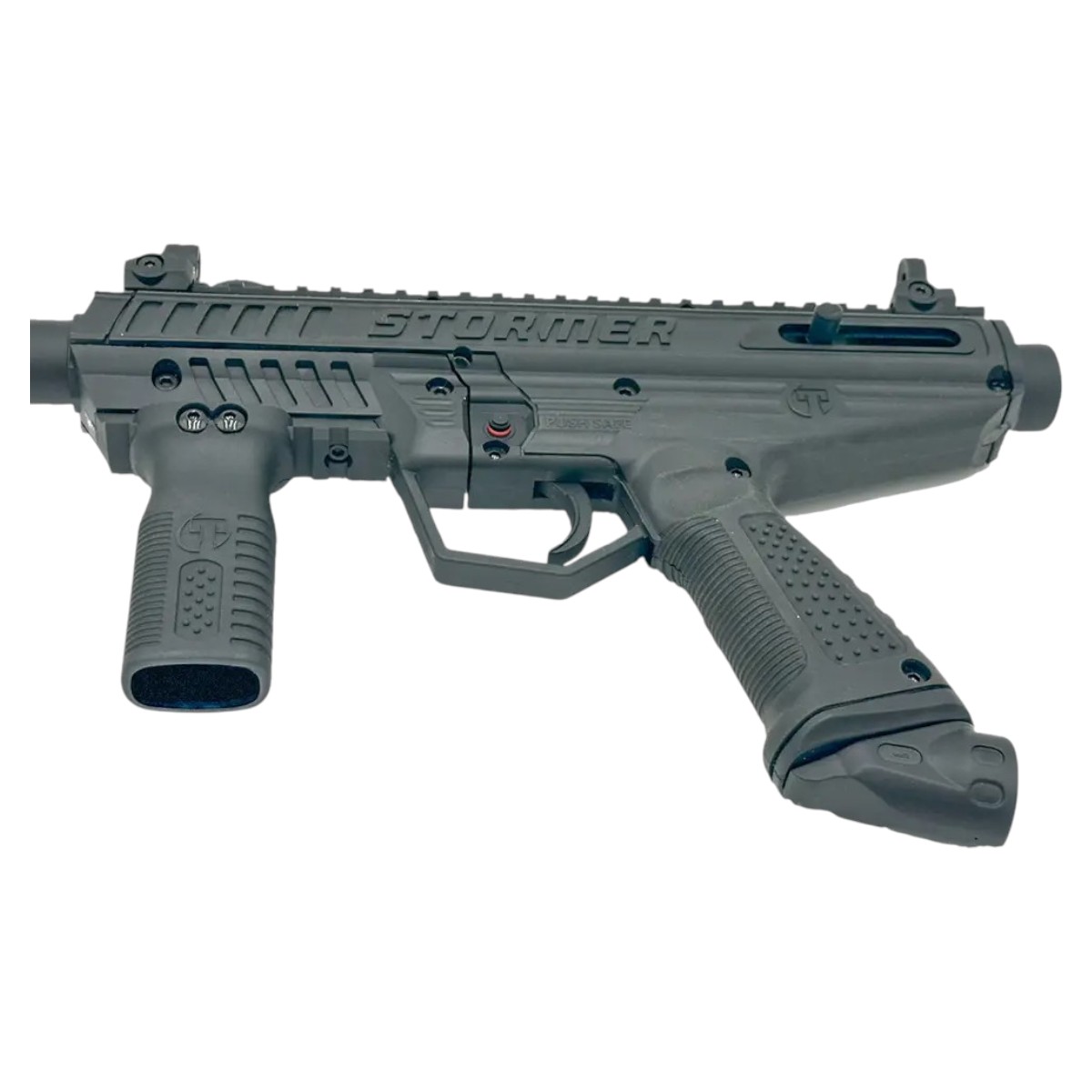 The Stormer Basic provides a rugged, reliable foundation equipped with Picatinny rails, a vertical foregrip, and a high-performance barrel ideal for players who want a straightforward, upgradeable marker. Stepping up to the Stormer Tactical introduces a more aggressive, military-inspired look and feel, thanks to the addition of a tactical front shroud, flip-up front and rear sights, and a 6-position collapsible stock perfect for those who want the aesthetics and functionality of a MilSim marker straight out of the box.